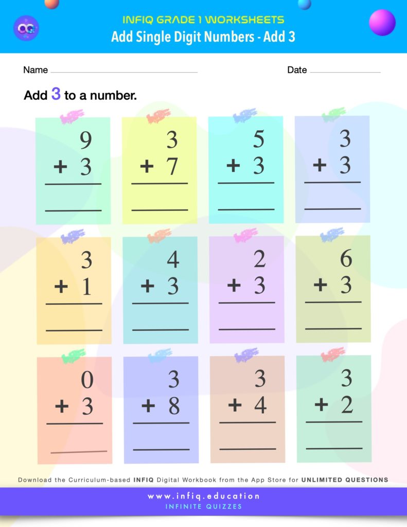 The grade 1 worksheets on this page will help the students practice & sharpen the concepts for Add Single Digit Numbers – Add 3.‘ The worksheets will improve the student’s understanding of adding 3 to another single digit number. The concept is foundational to the addition of numbers. The worksheets cover picture-based addition, addition of the numbers in the vertical format as well as addition of the numbers in the horizontal format. Students will also complete some addition sentences. The worksheets use different models to reinforce student’s understanding of the concept, while keeping them engaged and challenged.