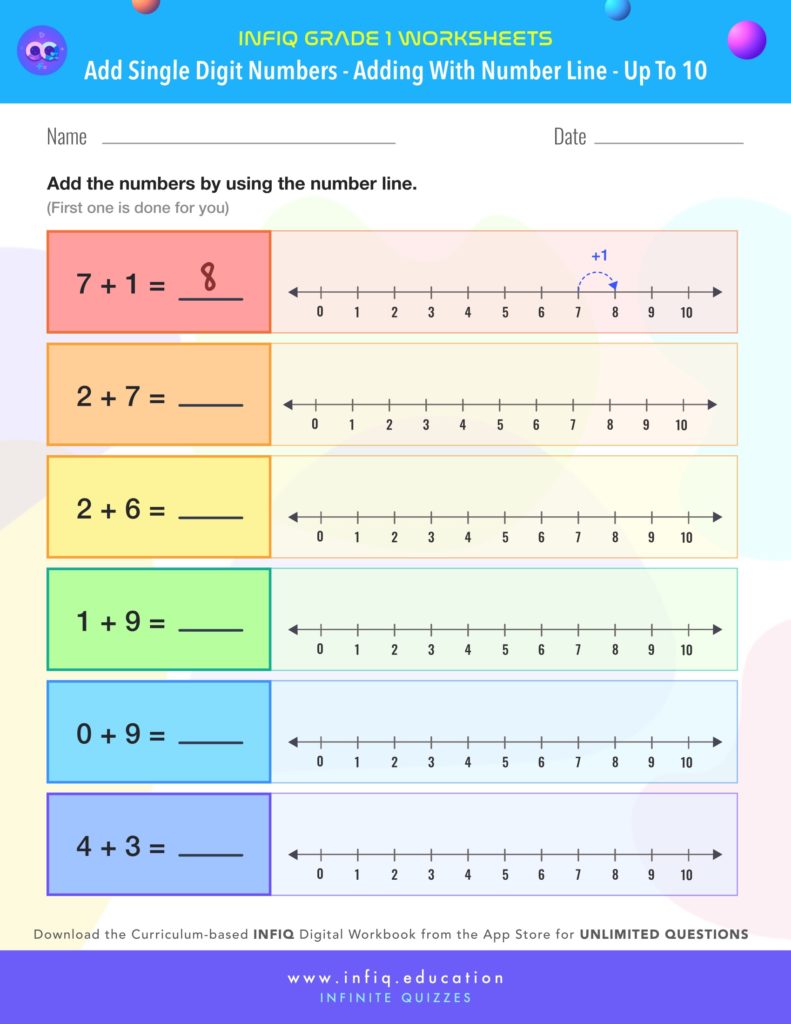 The grade 1 worksheets on this page will help the students practice & sharpen the concepts for Add Single Digit Numbers – Adding with number line (up to 10).‘ The worksheets will improve the student’s understanding of adding single digit numbers using number line. The worksheets cover single hop as well as multiple unitary hops to help the students understand the concept of adding a single digit number to another. The worksheets are designed to keeping the students engaged and challenged.