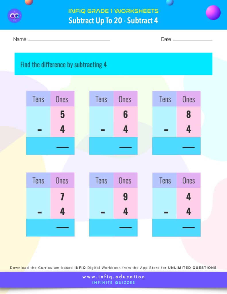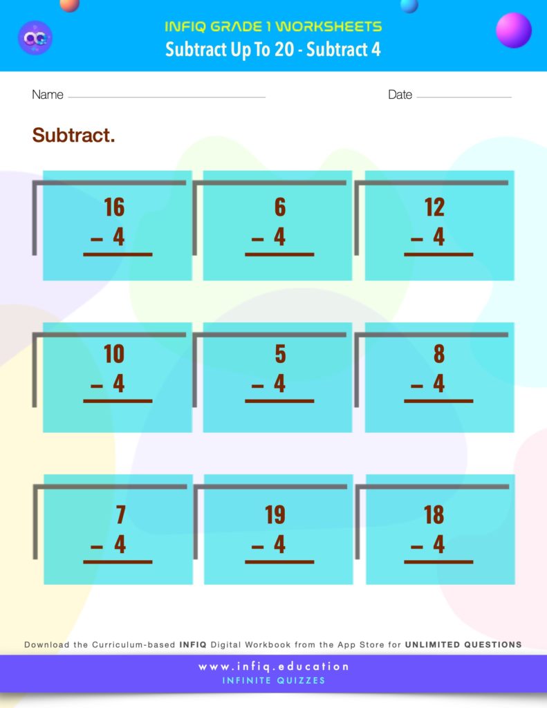The grade 1 worksheets on this page will help the students practice & sharpen the concepts for ‘Subtract up to 20: Subtract 4.’ The worksheets will improve the student’s understanding of subtracting 4 from numbers up to 20. The concept is foundational to the subtraction of numbers. The worksheets cover picture-based subtraction, the subtraction of the numbers in the vertical format as well as the subtraction of the numbers in the horizontal format. The worksheets use different models to reinforce student’s understanding of the concept, while keeping them engaged and challenged.