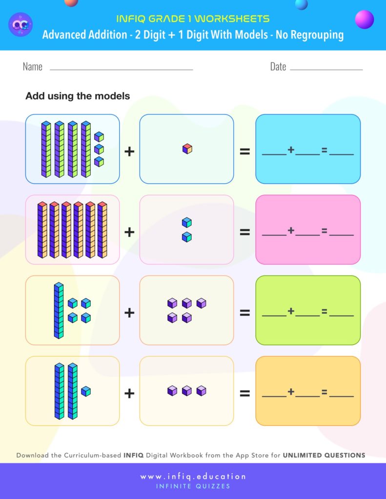 The grade 1 worksheets on this page will help the students practice & sharpen the concepts for ‘Advanced Addition – 2 Digit + 1 Digit with models – No Regrouping.‘ The worksheets use models with different combinations of the ‘2 Digit + 1 Digit‘ numbers to reinforce student’s understanding of the concept, while keeping them engaged and challenged. There are plenty of worksheets to give the students a well-rounded practice.