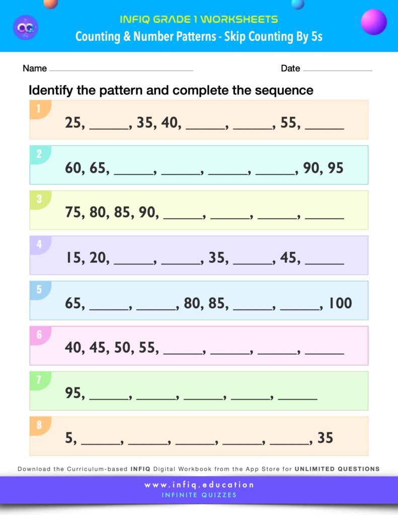 The grade 1 worksheets on this page will help the students practice & sharpen the concepts for ‘Counting and Number Patterns – Skip Counting By 5s.‘ The worksheets will improve the student’s understanding of skip counting by 5s, identifying patterns and completing the number sequences for a given number range, when skip counting by 5s. The worksheets use different models to reinforce student’s understanding of the concept, while keeping them engaged and challenged.